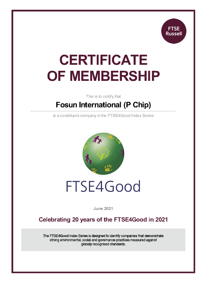 Classifica??o FTSE Russell ESG da Fosun International é atualizada e se torna o primeiro constituinte da série de índices FTSE4Good