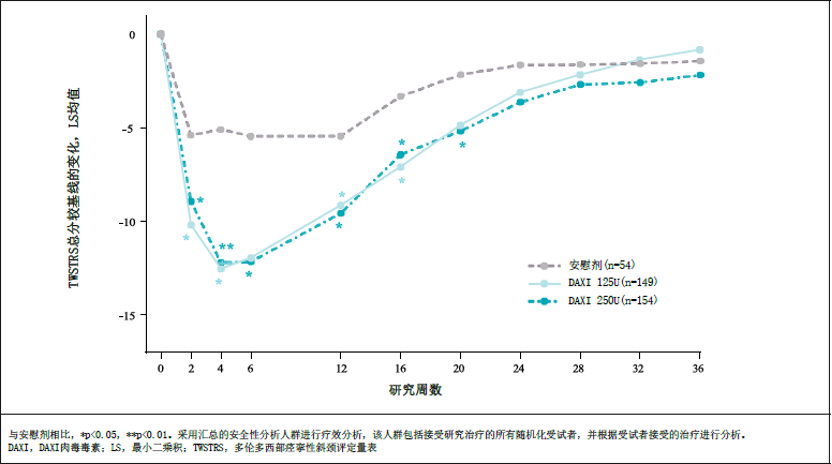 ASPEN-1ÊÇÒ»Ïî¹ú¼Ê¶àÖÐÐÄ¡¢Ëæ»ú¡¢Ë«Ã¤¡¢°²Î¿¼Á¶ÔÕÕÑÐÌÖ7£¨clinicaltrials×¢²áºÅ£ºNCT03608397£©£¬¹²ÕÐﻼÕß301ÈË¡£ASPEN-1-CNÔÚÖйú½øÐУ¬ÑÐÌÖÉè¼ÆÓëASPEN-1Ïà·´¡£ASPEN-1ºÍASPEN-CN»ã×Ü·ÖÎö¹²ÄÉÈ뻼Õß357ÈË8£¬ÆäÖк¬ÖйúIIIÆÚ»¼Õß56ÈË£¬Õ¼·ÖÎöÈËȺµÄ15.7%¡£»ã×Ü·ÖÎö½á¹ûÏÔʾ£¬Ó밲ο¼ÁÏà±È£¬µÚ4Öܺ͵Ú6ÖܶàÂ×¶à¶«·½¾·ÂÎÐÔб¾±ÆÀ·ÖÁ¿±í£¨TWSTRS£©×ֽܷϻùÏߵı仯¾ùÖµ£¨DAXI 125U×éΪ-12.0£¬DAXI 250U×éΪ-11.9£©¾ùÓÐͳ¼ÆÑ§²îÒ죨p<0.0001£©£¬Á½ÖÖ¼ÁÁ¿¾ùÄÜÃ÷ÏÔ½µµÍTWSTRS×Ü·Ö£¬¸ÄÉÆ»¼ÕßÖ¢×´¡£ÖÐλÁÆÐ§³ÖÐø¹¤·ò£¨¶¨ÒåΪ´Ó¿ªÊ¼ÖÎÁƵ½TWSTRS×Ü·Ö¸ÄÉÆÁÆÐ§Ëðʧµ½×îСʣÓàºÃ´¦£¨¡°minimum residual benefit¡±£¬¼´TWSTRS×ÜÆÀ·Ö¸ÄÉÆµÄ·åÖµÖÎÁÆÐ§¹ûËðʧ³¬¹ý80 %£©µÄ¹¤·ò£©£¨95%CI£©·Ö±ðΪ£º´ïϣ쳮 250U£º22.0(20.1£¬24.3)ÖÜ £»´ïϣ쳮 125U£º24.1£¨20.6£¬28.9£©ÖÜ£¨¼ûͼ1£©¡£°²È«ÐÔ·½Ã棬´ó¶àÊýÖÎÁÆÖгöÏֵIJ»Á¼ÊÂÇ飨TEAE£©ÎªÇá¶È»òÖжȡ£ÖÎÁÆ×éÖÐÍÌÑÊÀ§ÄÑ·¢ÉúÂÊ4.5-4.7%£¬¼¡ÓÐÁ¦·¢ÉúÂÊ4.5-5.4%£¬µÍÓÚ¼ÈÍù»ñÅúµÄÓÃÓÚCDÖÎÁÆµÄÆäËûAÐÍÈâ¶¾¶¾ËزúÆ·µÄ¹Ø¼üÁÙ´²ÑÐÌÖÊý¾Ý4,12,13¡£