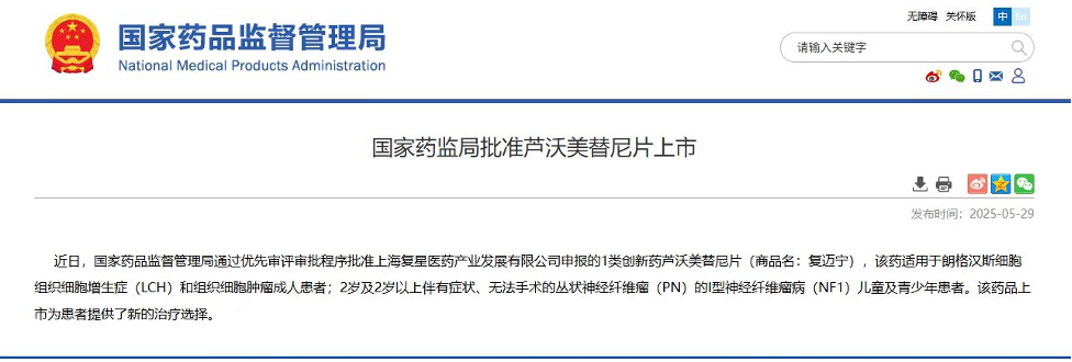 5ÔÂ29ÈÕ£¬¸´ÐÇÒ½Ò©Ðû²¼£¬×ÔÖ÷Ñз¢µÄ1ÀàÐÂҩ«ÎÖÃÀÌæÄáÆ¬£¨ÉÌÆ·Ãû£º¸´ÂõÄþ®£»ÏîÄ¿´úºÅ£ºFCN-159£©Õýʽ»ñµÃ¹ú¼ÒÒ©Æ·¼à¶½¹ÜÀí¾Ö£¨NMPA£©Í¬ÒâÉÏÊС£×÷Ϊһ¿î¸ßÑ¡ÔñÐÔMEK1/2ÒÖÖÆ¼Á£¬¸´ÂõÄþ±¾´Î»ñÅúµÄÁ½Ïî˳Ӧ֢·Ö±ðÓÃÓÚÖÎÁÆ£ºÀʸñººË¹Ï¸°û×é֯ϸ°ûÔöÉúÖ¢£¨LCH£©ºÍ×é֯ϸ°ûÖ×Áö³ÉÈË»¼Õߣ¬ÒÔ¼°2Ëê¼°2ËêÒÔÉϰéÓÐÖ¢×´¡¢ÎÞ·¨ÊÖÊõµÄ´Ô×´Éñ¾ÏËάÁö£¨PN£©µÄIÐÍÉñ¾ÏËάÁö²¡£¨NF1£©¶ùͯ¼°ÇàÉÙÄ껼Õß¡£¸´ÂõÄþµÄ˫˳Ӧ֢»ñÅúÌî²¹ÁËÏà¹ØÏ¡ÓÐÖ×ÁöÁìÓòµÄÖÎÁÆÐèÇó£¬Îª»¼ÕßÌṩÁËеÄÖÎÁÆÑ¡Ôñ¡£