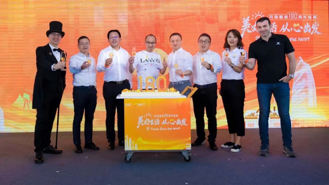 复星国际董事长郭广昌(左四),复星国际联席CEO徐晓亮(左五),复星旅文董事长兼CEO钱建农(左三)等嘉宾共同为Thomas Cook托迈酷客品牌180周年庆生