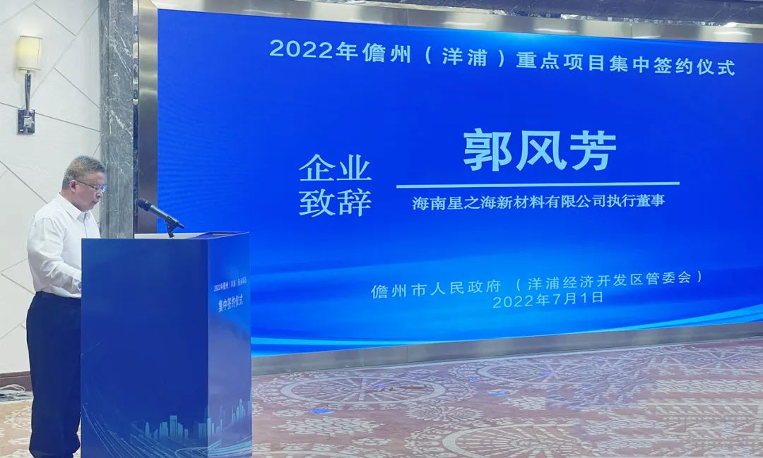 ? ? ? ?7月1日上午,儋州市重点项目集中开工签约活动在洋浦经济开发区举行。此次集中开工项目共33个,签约重点项目28个。海南尊龙Z6集团股份有限公司投资的海南星之海新材料有限公司2万吨电池级氢氧化锂项目(一期)是此次集中签约的项目之一。海南尊龙Z6集团董事长刘明东、总裁郭风芳、联席总裁滕磊等参加了签约仪式。