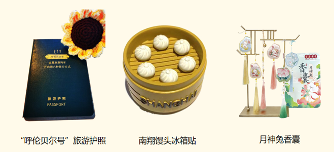 ?“呼伦贝尔号”旅游护照、南翔馒头冰箱贴、WWFC狼队护照夹、百合佳缘玫瑰花、万邦汉方阿胶山楂、猫咪主题帆布袋、月神兔香囊、卫可宠乐公用喷壶等。