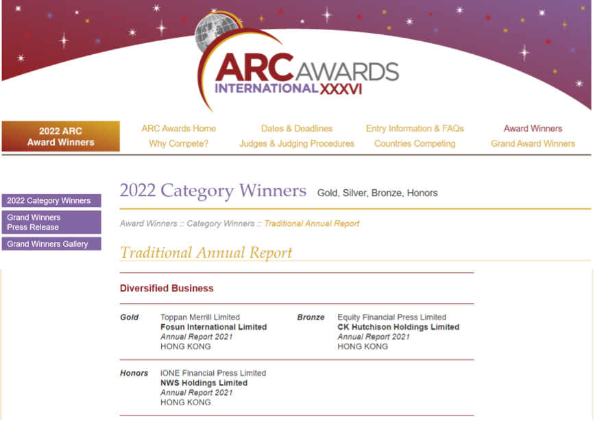 International ARC Awards?从1987年开始举办,是全球享负盛名表彰优秀年报的评审比赛,被誉为“年报界奥斯卡”,由美国独立机构?MerComm, Inc.?主办。International ARC Awards?因公开、公正而在全球出名,并为年报业界定下最高的标准,每年吸引逾千家来自全球不同行业的企业、政府部门、非牟利机构及集团参赛。