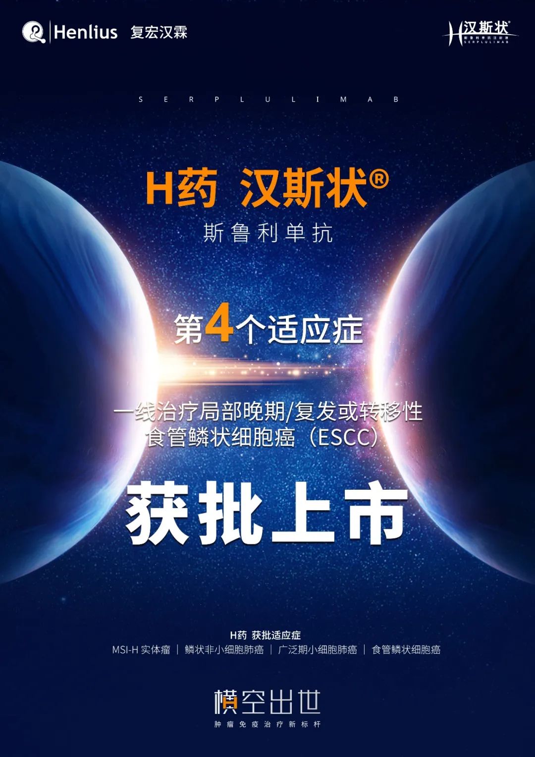 2023Äê9ÔÂ22ÈÕ£¬ÉϺ£-¸´ºêººÁØ£¨2696.HK£©Ðû²¼£¬¹«Ë¾×ÔÖ÷Ñз¢µÄ´´Ð¿¹PD-1µ¥¿¹HÒ©¡ª¡ªººË¹×´®£¨Í¨ÓÃÃû£ºË¹Â³Àûµ¥¿¹×¢ÉäÒº£©ÁªºÏº¬·úÄòà×à¤ÀàºÍ²¬ÀàÒ©ÎïÓÃÓÚPD-L1ÑôÐԵIJ»¿ÉÇгý¾Ö²¿ÔçÆÚ/¸´·¢»ò×ªÒÆÐÔʳ¹ÜÁÛ״ϸ°û°©(ESCC)µÄÒ»ÏßÖÎÁÆÐÂ˳Ӧ֢µÄÉÏÊÐ×¢²á¿ÒÇó(NDA)»ñµÃ¹ú¼ÒÒ©Æ·¼à¶½¹ÜÀí¾ÖͬÒ⣬Ϊʳ¹ÜÁÛ°©»¼ÕßÌṩÁËÖÎÁÆÐÂÑ¡Ôñ¡£´Ëǰ£¬HÒ©ÒÑ»ñÅúÖÎÁÆÎ¢ÎÀÐǸ߶Ȳ»²¨¶¯(MSI-H)ʵÌåÁö¡¢ÁÛ×´·ÇСϸ°û·Î°©£¨sqNSCLC£©ºÍ¹ã·ºÆÚСϸ°û·Î°©£¨ES-SCLC£©ÈýÏî˳Ӧ֢¡£¸´ºêººÁسÖÐøÉHÒ©Ôڷΰ©¡¢Ïû»¯µÀÖ×ÁöµÈÁìÓòµÄ²îÒ컯¡¢¶àά¶È¹æ»®£¬ÒÔÆÚÍÆ½ø»¼Õß»ñµÃ¸ü¸ß»ñÒæ¡£