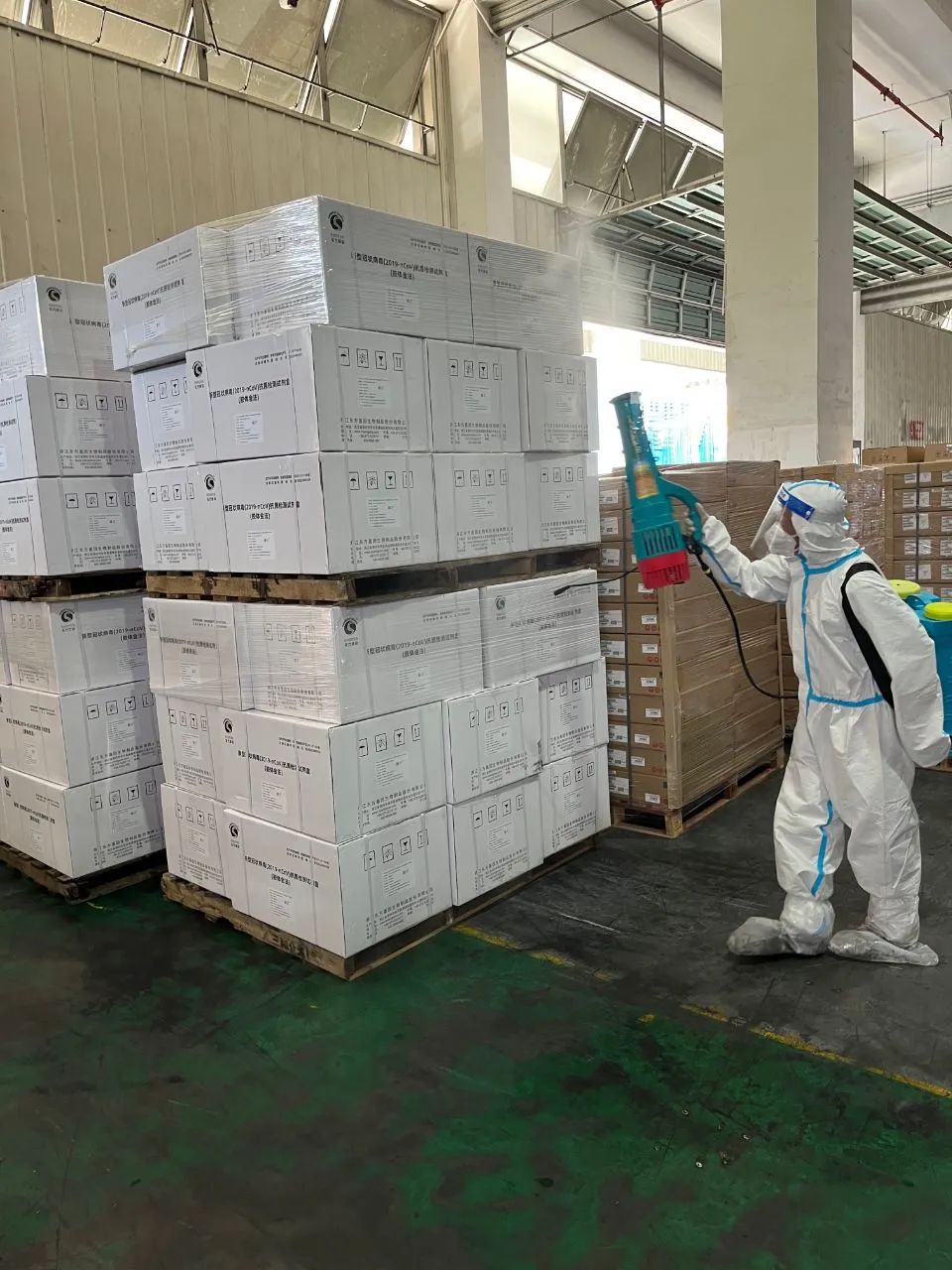 ▲复星商社工作人员对物资做出库前的再次消杀。