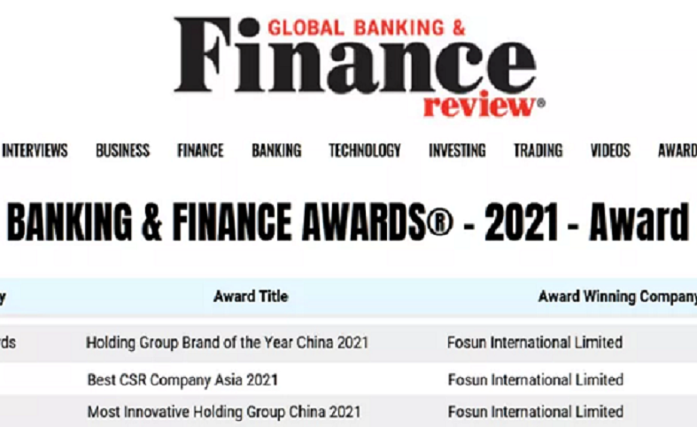 Am 2. August 2021 wurde Fosun International von Global Banking and Finance Review, einem bekannten Finanzmagazin im Vereinigten K?nigreich, mit drei Auszeichnungen ?Corporate Social Responsibility (CSR) - Beste CSR Firma Asien 2021¡°, ?Marke des Jahres ¨C Holding-Gruppe-Marke des Jahres China 2021¡° und ?Business Auszeichnung - Innovativste Holding-Gruppe China 2021¡° geehr