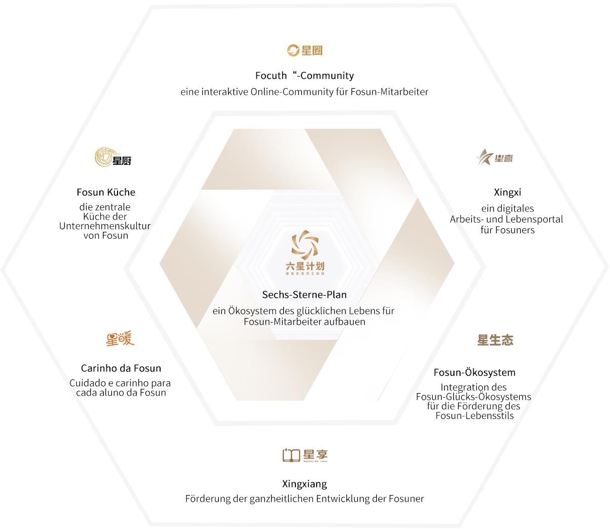 Fosuns?Sechs-Sterne-Plan“ für Mitarbeitererfahrungen im ESG-?kosystem ist Fosunswichtigste Plattform, um das Karrieremanagement der Mitarbeiter zu vertiefenund Fosuns Unternehmenskultur und Fosuns Glücks?kosystem zu integrieren. Der?Sechs-Sterne-Plan“ zielt darauf ab, das Mitarbeitererlebnis der Fosunerumfassend zu verbessern. W?hrend der Plan die Umsetzung vonUnternehmensstrategien unterstützt, schafft er auch mehr Berührungspunkte mitdem ?kosystem, indem er verschiedene Szenarien aufbaut, die das Arbeits- undFamilienleben der Mitarbeiter integrieren und so die Nachhaltigkeit von FC2Mund den Wert des ?kosystems erreichen und Glück mit jedem Mitarbeiter undseiner Familie teilen.